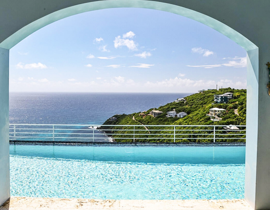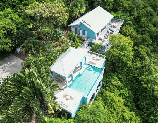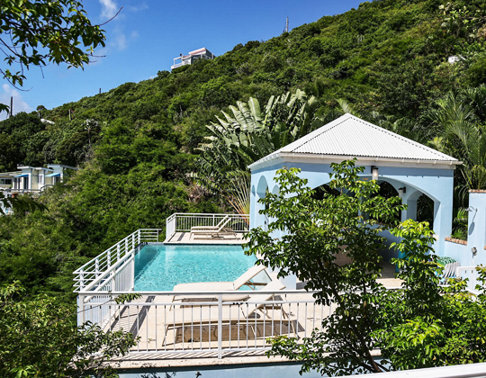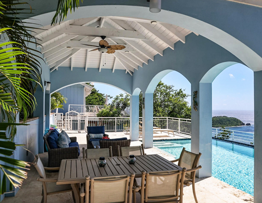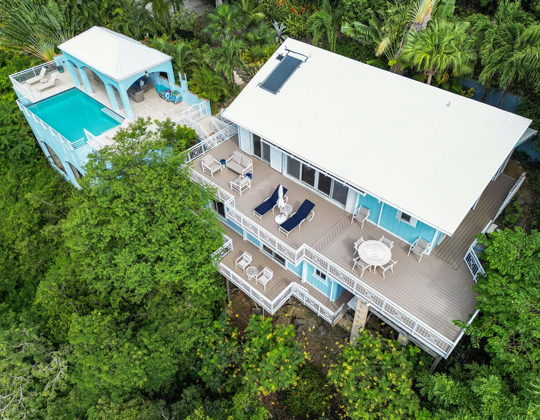 Ballena Blue is a beautiful 3-bedroom, 3-bath Villa featuring a new pool surrounded by a spacious sun deck and shaded cabana area perfect for lounging, dining, and grilling. From both the villa and the pool (conveniently situated side by side) you will enjoy sweeping panoramic views of Rendezvous Bay and beyond to St. Croix.