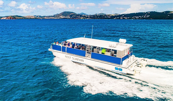 Departing St. Thomas at 2:00 PM and arriving on the beach in Cruz Bay next to the People Ferry at 2:30 PM.  Drop off St. John Guests around 7:00 PM and return to dock in St. Thomas at 7:30 PM.   St. John Guests check in at 2:00 PM at the Ocean Surfari Retail Store next to the People Ferry in Cruz Bay.