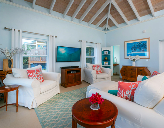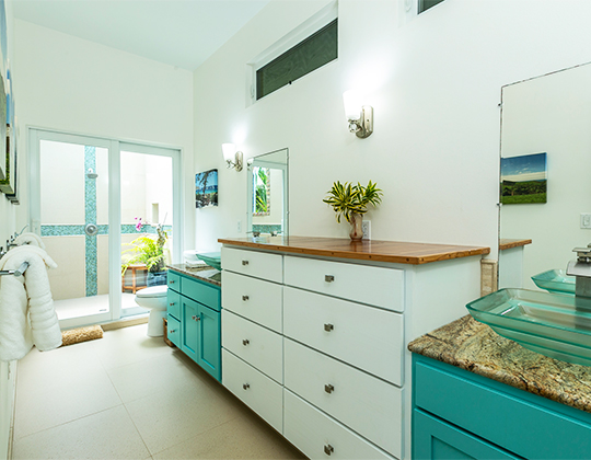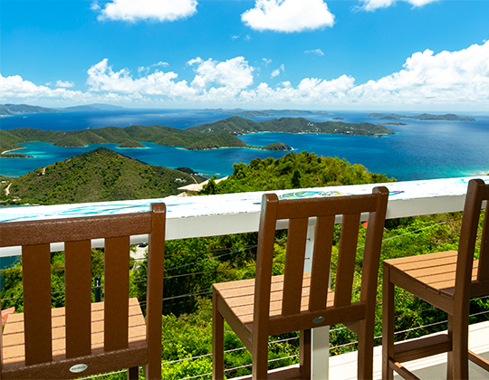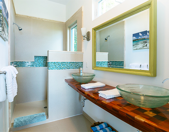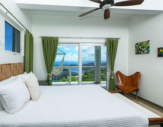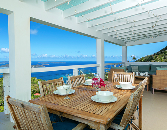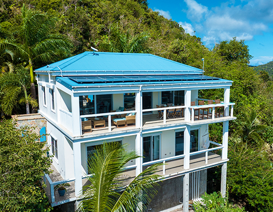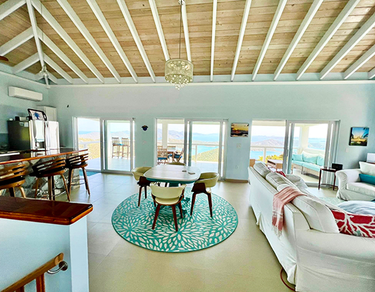 This new, beautiful two bedroom home has two fully enclosed stories – no external staircases required to access baths and bedrooms – and arguably, the most magnificent views on the island. From the moment you enter the main level, you will be captivated by the breathtaking scene.  The open concept allows Guests ample room to stretch out while still feeling connected to one another.  The fully-equipped kitchen seamlessly flows into the dining and living areas.  Sliding glass doors in each living section will beckon you outside onto your large covered porch.  Absorb the fresh air and spectacular views on this expansive porch that is comfortably furnished with bar stools overlooking Coral Bay, teak dining table with seating for six, and Sunbrella cushioned sofa and club chairs.  Back inside, the interior stairwell leads you down to a hall and laundry area and two spacious bedrooms.  Each bedroom is air conditioned and features a large ensuite bathroom with double vanities.  One bedroom has a king size bed and outdoor shower.  The second bedroom has a queen size bed.  Both bedrooms have sliding glass doors that open up to another full porch with more breathtaking views.  A full size washing machine and clothes dryer is located on this floor for your use and convenience.