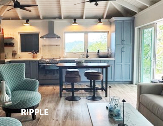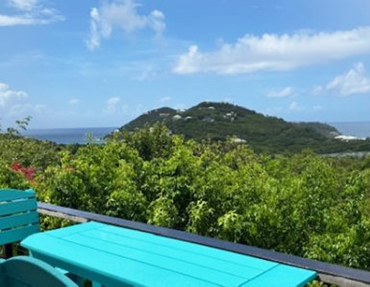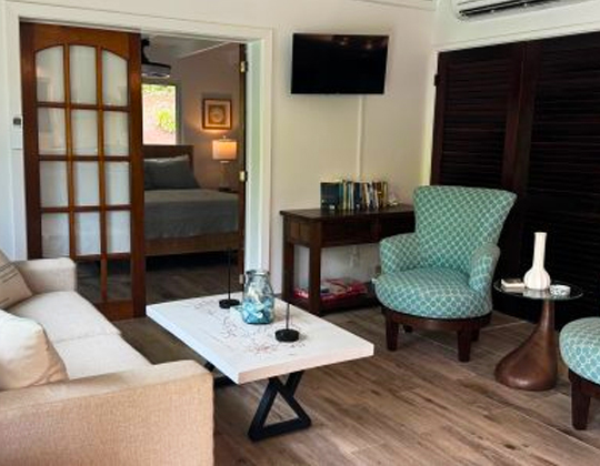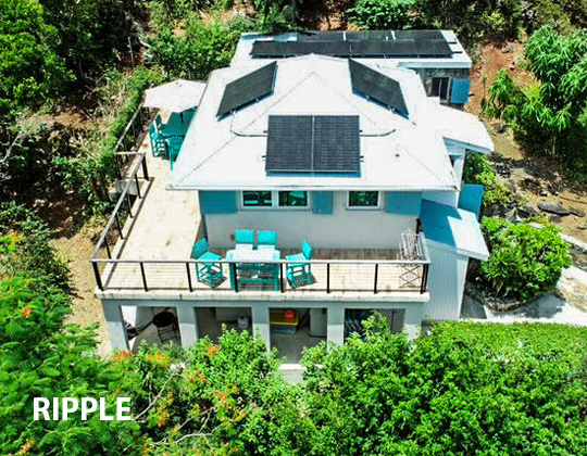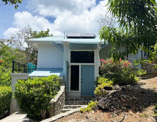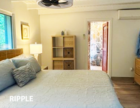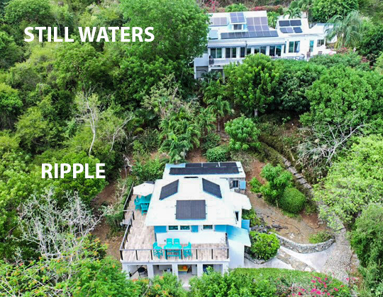 RIPPLE is a beautifully remodeled 2 bedroom 2 bath masonry home with Hart Bay & Chocolate Hole views with a completely separate road access. Still Waters sits above with the driveway off a different road. Attention to detail and maintenance has been the current owners objective with more solar, power walls, and new furnishings. Upper bedroom has a king bed and ensuite bath, and lower bedroom has a queen bed with bath. A/C in living area and primary suite. Lower bedroom cools nicely from the upstairs A/C unit.